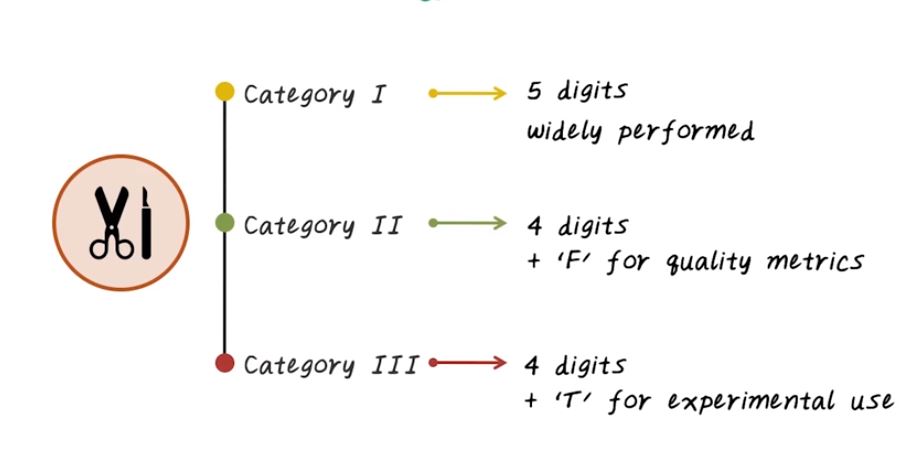 CPT code is another important coding system used in US healthcare. CPT stands for Current Procedure Terminology. The focus of CPT is to describe medical, surgical, and diagnostic services. It’s a US standard for coding medical procedures. CPT is maintained by American Medical Association. And CPT is mainly used by insurance company to determine how much to pay for a medical service. In general, reimbursement rate will be associated with each CPT code has been used in the claims. So CPT is very important in the US, since it tied to how much money doctor will make. Now let’s talk about CPT code in more details. CPT is a five digit code, has three different categories. Category one, corresponding to widely performed procedures. And Category two, corresponding to quality metrics performed in healthcare organization. Then we have Category three, it’s again four digits, follows with letter T for experimental use. Now let’s talk about Category one, CPT code. We can take quick look at the different sections of Category one CPT code. They’re arranged in their numerical ranges. They are divided into six sections, Evaluation and Management, Anesthesia, Surgery, Radiology, Pathology and Laboratory, Medicine. And, here are the Category two CPT code. There are supplementary code for tracking the performance measure. And the different ranges of the code map to different types of services. It include, Composite measures, Patient management, Patient history, Physical examination, Diagnostic/screening process and result, Therapeutic and preventive or other interventions, Follow up or other outcome, Patient safety and Structural measures. For example, blood pressure measured is one of the Composite measures, and there are other Composite measures, as well, they’re all in this range.