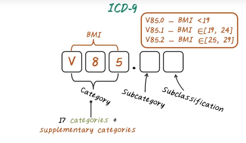 ICD-9 code in the 17 categories have only numerical digits. For example, 250 is a category code for diabetes. And 250.01 is the subclassification for type one diabetes without complications. In addition to the 17 categories, there are supplementary categories starting with letter E or letter V. For example, V85, corresponding to body mass index. And V85.0 indicate BMI less that 19. V85.1 indicate BMI between 19 and 24.