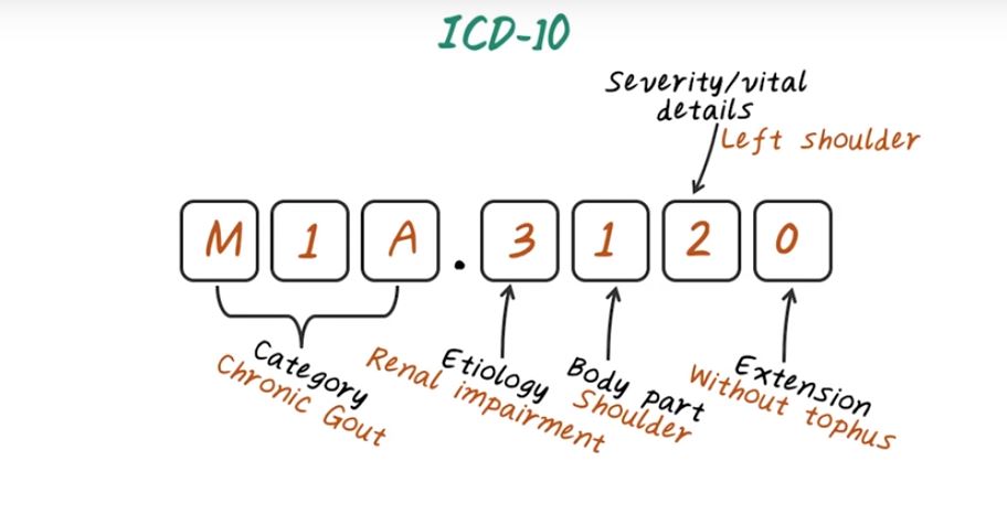 And V85.2 indicate BMI between 25 and Now lets talk about ICD-10 code. ICD-10 code can have seven alphanumerical characters. So it’s longer than ICD-9 code, which only have five digits. First three characters indicate the disease category. The fourth character indicates Etiology of the disease. That is the cause of the disease. The fifth character indicate body part affected. And the six characters indicate the severity of the eonis. And the character seven is the place holder for extension of the code to increase specificity. For example, E110, indicate disease category with type one diabetes. And nine indicate there’s no complication. Here’s an example of a more complicated ICD-10 code. M1A indicates the disease, chronic gout disease. And a three indicate the Etiology of renal impairment. And one indicate the body part, in this case is the shoulder. And two indicate the severity or vital details, so in this case two means the left shoulder. And the last one, zero for extension. Here zero means without tophus. So as you can see ICD-10 code can be quite complicated.