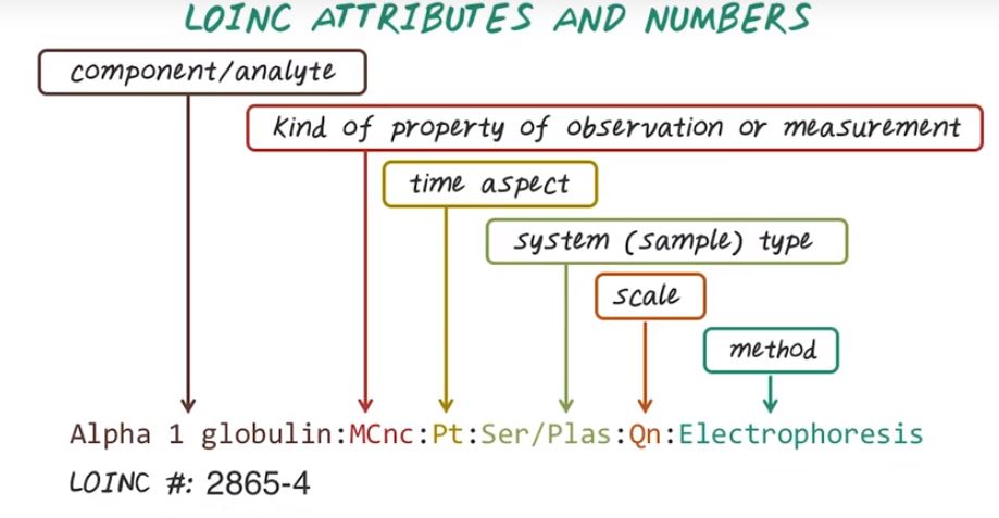 Let us talk about loinc attribute and loinc number. Here’s the attribute of a specific loinc code. They’re separated by colon. The first part is the component name and this specify the specific lab test. The second part is the property of the lab measurement. And the third part is a time aspect whether it’s measured at a point of time or over some durations specified here. Here Pt means point of time. The fourth part is a type of sample. For example, serum or plasma in this example. Next is the scale. The scale may be quantitative, ordinal, or nominal or narrative. Finally, we have the method, that has been used to conduct this lab test. And this particular attribute corresponding to a LOINC number of 2865-4.