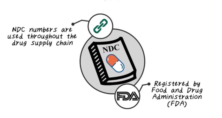 Next, let’s talk about NDC code. NDC stands for National Drug Code. NDC is the standard for medications, and NDC is registered and maintained by FDA, the Food and Drug Administration. And FDA maintains a searchable database of all the NDC code on their website. NDC code are used throughout the entire drug supply chain, from pharmaceutical company to drug distribution companies, to medical community, and to insurance company, and government. They all use NDC code to track medications. NDC have three parts.