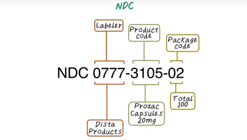 The first part is the four to five digits that indicates the labeler that is a company produce the drug. 0777 is a labeler code for Dista Products, and the second part is the product code to indicate what drug it is. For example, 3105 corresponds to Prozac Capsules of 20mg. And then the final one or two digit corresponding to the package code. In this case, 02 indicate there are hundred pills in this package. NDC code exists in different ways of grouping those three segments. It has a four digit here as labeler, four digit here as the product code, and two digit as a package code. Or it could have a five digit labeler, three digit product code and two digit package. Or it could have five digit labeler, four digit product code and one digit package code. But overall, all NDC code have ten digits.