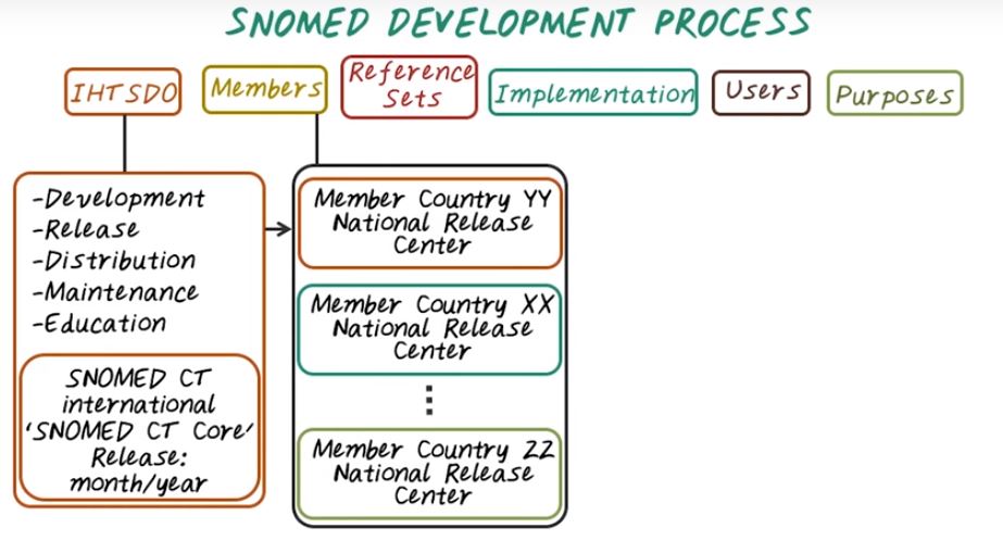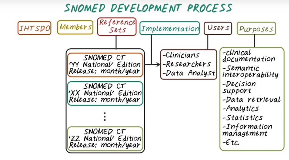 Then there’s different implementation which may only cover a subset of the entire reference set within a country. Then once we have the implementation of SNOMED. And the users of SNOMED are quite broad. They could be clinicians, researchers, or data analysts. And the purpose of SNOMED is to help improve clinical documentation and understand semantic interoperability of medical concepts, and to enable clinical decision support, as well as data retrieval, analytics, statistics, information management purpose.