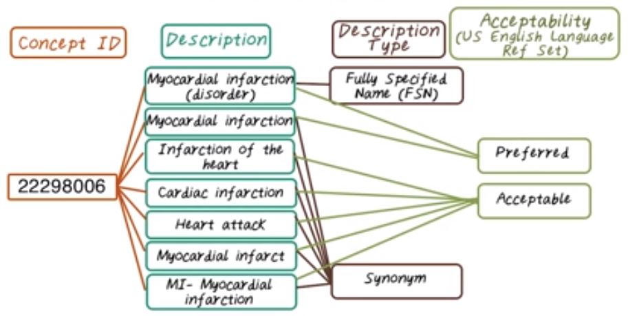 Now let’s see an example of SNOMED concept. The concept ID is the following, 22298006. It is definitely in a machine readable form. This concept ID is associated with different descriptions, and among which myocardial infarction disorder is a fully specified name for this concept. Then there are many synonyms include myocardial infarction, infarction of the heart, MI, heart attack, and so on. Some of those description are considered preferred. For example, myocardial infarction disorder and myocardial infarction. And some are considered acceptable. So the rest of those descriptions are considered acceptable. So note that the concept of preferred or acceptable, they’re implemented in the US English Language Reference Set, which may not be in the reference set from other countries.