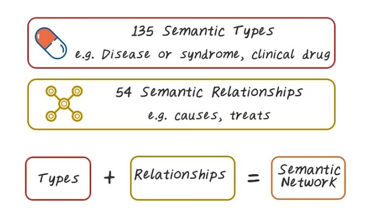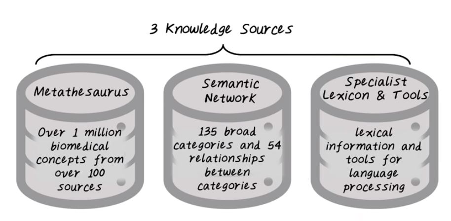 So what are the different components in UMLS? So UMLS recognizes that there are many existing ontologies and terminologies. They want to integrate all of them together, you see one system, so that people can access all of those medical concepts through the systems. There are three knowledge sources in UMLS, the metathesaurus, semantic network, and specialist, lexicon and tools. There’s over 1 million biomedical concepts from over 100 different sources that constitute this medical storage. It includes all the ones we have talked about such as ICD and Snomed. It covers 135 broad categories and 54 different type of relationship between all those concepts, and the semantic type and relationship provide a consistent categorization of concept and their relationship represented in UMLS metathesaurus. Third is the lexicon information and tools that can help processing medical texts. Next, let’s provide more details on each one of them.