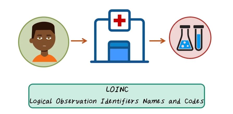 Now let’s talk about health data standards. There are many different health data standards. In this lecture, we’ll present several important ones. Each has its own unique focus. Let’s illustrate all those data standards through an example of patient encounter. For example, this patient is coming to hospital to get a lab test, and the result of the lab test is stored using LOINC, or Logical Observation Identifiers Names and Codes. LOINC typically represents all different kinds of lab tests.
