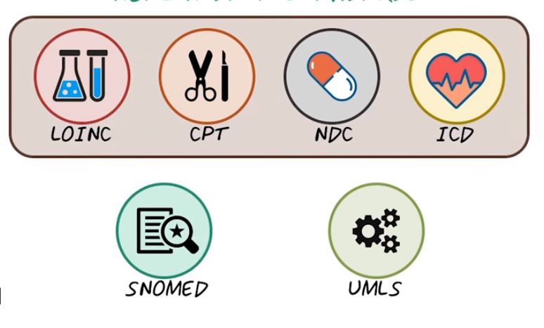 The most popular medical ontology is called SNOMED, it stands for Systemized Nomenclature of Medicine. It’s a huge graph of medical concepts and their relations. Of course, to utilize all this information in a huge oncology like SNOMED, you need software systems to interact with all those concepts and relations. The most popular software for accessing this medical knowledge is UMLS. It stands for Unified Medical Language System. UMLS is a set of software tools that provide integration of multiple sources of medical knowledge and medical ontologies. So next we’ll talk about all these different health data standards. We’ll first cover all those individual set of data standards for different types of medical data. Then we’ll talk about SNOMED and UMLS as a way to integrate all those different medical concepts together. All these health data standards are very important to support common healthcare operations, such as efficient insurance claim processing. For example, when a healthcare encounter has happened and all this information has been recorded through electronic health records, and that information will be sent to an insurance company in order to process those claims so that the doctor can get paid. And all those health data standards support efficient insurance processing. The secondary use of these health data standards are to support research and development. Because house care’s data are encoded largely in structured forms, so that it can be easily analyzed and standardized. Next we’ll introduce all of them in more details.