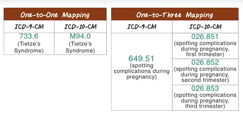 Because of the practical need, there are a huge effort involved in mapping from ICD-9 code to ICD-10 code. In general, a mapping from ICD-9 code to ICD-10 code is a one-to- many relationship, because ICD-10 code is just more specific than ICD-9. So in some cases, ICD-9 is already pretty specific. In this case, they will have one-to-one mapping. For example, for this Tietze’s Syndrome, they are both having unique code in ICD-9 and ICD-10. So the mapping is one-to-one. But in most cases, we’ll see one-to-many mappings. For example, 649.51, spotting complications during pregnancy, maps to three codes in ICD-10. So in this case, complications during each trimester has its separate code in ICD-10. Sometimes the mapping from ICD-9 to ICD-10 can be quite complicated. For example, 733.82 in ICD-9 has a mapping of 2,530 in ICD-10. So ICD 10 is just going through a lot more details about the disease. So, the mapping can be quite tricky.