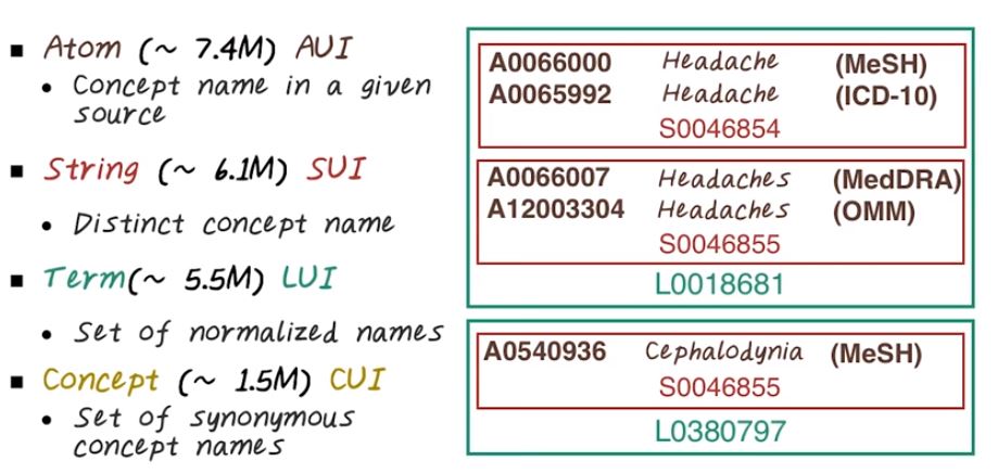 Metathesaurus Concepts. The idea is very similar to SNOMED. Each concept has a specific identifier and organized into a hierarchy. At the lowest level we have atom, at over 7.4 million atoms or AUI. Those are concept name in a specific source. For example, all this different AUIs mapped to something related to headache. Then there are strings, they’re are distinct concept names. So you notice that on the atom level even the same mention can have different AUI because they come from different ontology, different sources. One from MeSH, one from ICD-10. But they have the same string, so string or SUI will be the same. Then we have terms, that’s a set of normalized names. For example here, headache and headaches all map to the same term, or LUI. Then on the highest level, we have concept, or CUI. That’s a set of synonyms. And all of this together, for example, correspond to a single CUI, or cooey.