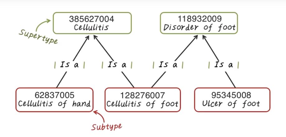 Now let’s talk about IS a relationship. IS a relationship indicate generalization from a specific concept to a more general concept. For example, cellulitis of foot is a cellulitis, so this is a IS a relationship. At the same times, cellulitis of foot is also a disorder of foot. So there’s two different paths to generalize this concept. And you notice that IS a relationship is directional. So two concept are directly linked by IS a relationship. The source concept is said to be the subtype. And the destination concept is said to be the supertype. If we generalize all those concepts to the most general forms, we have a single root of the entire hierarchy. Besides IS a relationship, there are other relationship as well. For example, abscesses of heart Is associated morphology to abscesses. And it has a finding site to heart structure.